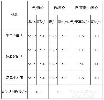 表2 次氯酸鈉法與手工分解法氨綸結(jié)果比較