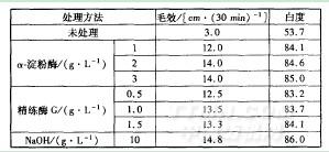 將竹材Lyocell纖維織物分別用β-淀粉酶(質(zhì)量濃度為1~3g/L)、精練酶G(質(zhì)量濃度為0.5~1.5g/L)和l0L的NaOH進(jìn)行退煮,然后用H2O2漂白,處理后織物白度和毛效見表1。