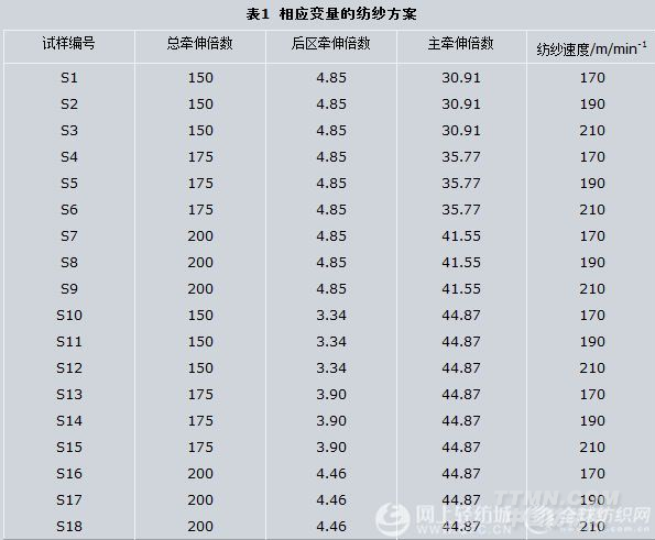 以腈綸纖維(51mm×1.5d)為原料,以不同的紡紗速度和總牽伸倍數(shù),在村田MJS-802噴氣紡紗機上紡制14.76 tex的噴氣紗。在18組試驗中,一批試樣保持后區(qū)牽伸倍數(shù)不變,為4.85,而改變總牽伸倍數(shù)。另一批試樣保持主牽伸倍數(shù)不變,為44.87,而改變后區(qū)牽伸倍數(shù)。噴氣紡紗前的準備工序包括在MMC梳棉機上梳棉和Laksh.mi Rieter D02S并條機上的三道并條工序。熟條的線密度作相應調(diào)整,以符合在噴氣紡紗機上要求的牽伸倍數(shù),分別為150,175,200。在開清階段混入約占總重1%的有色纖維作為示蹤纖維。試樣的紡紗參數(shù)見表1。