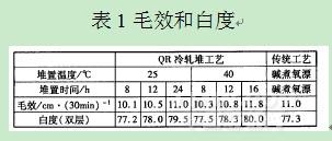 QR冷軋堆工藝在25℃和40℃溫度下堆置不同時間,測試織物的毛效和白度,并與傳統工藝比較,結果見表1。
