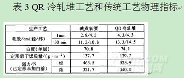 (2)QR冷軋堆工藝加工的織物白度和強力都高于傳統工藝,手感柔軟滑爽,半制品無堿斑,無風干印等疵病。布面棉籽殼去除較凈,各項指標可滿足染色或印花工序對半制品的工藝要求。