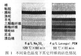 CDP纖維用陽離子染料染色時,需在高溫條件下進行,以利于染料的滲透,對比98℃(加載體)以及120℃染色,可以發現,在較低的染色溫度下,對其它纖維沾色嚴重,如圖1所示。