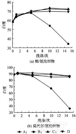 圖1是在不同洗滌次數(shù)下,不同洗滌劑對棉/氨綸和莫代爾/氨綸織物白度的影響。