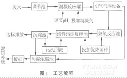 天津某印染針織廠是集染、紡、織于一體的出口型生產企業,公司散纖維年產量600 t,粗紡、半精紡產品綜合年產量為600 t,毛衫年生產量100 萬件,每天產生的印染廢水達150 t。廢水主要來源于退漿、精煉、漂洗、高溫染色、漂白、絲光、整理等工序的有機廢水。該廠現有1 套設計處理量為150 t/d的印染廢水處理系統,然COD 去除率較低、出水色度偏高,其指標超出《紡織染整工業水污染物排放標準》(GB 4287—1992)Ⅱ級標準。該廠委托中海油天津化工研究設計院對其系統進行改進,以便能使廢水達標排放。經分析,其處理系統的混凝加藥部分存在缺陷,為此筆者采用了新的高效脫色絮凝劑進行試驗,并對其加藥方案進行了調整,改進后污水處理系統的出水水質能夠達到《紡織染整工業水污染物排放標準》(GB 4287—1992)Ⅰ級標準。