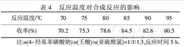 由表5可見,隨著反應時間的延長,目標產物的收率隨之增加,5 h后,再延長反應時間收率有下降的趨勢.原因為酯化反應是可逆反應,反應時間較長時,4-表3 n(4-羥基苯磺酸鈉)∶n(壬酸)對合成反應的影響