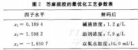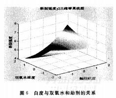 白度有效回歸方程為:Y343.5525+2.9218x1—1.9875x2X3+1.5736x;+1.6620x;圖6是白度與雙氧水和助劑的關系圖解.堿液濃度對白度的影響是顯著的,而助劑濃度和雙氧水濃度對白度的影響不顯著,但助劑濃度和雙氧水濃度的交互作用對白度有較大的作用.由回歸方程可知,白度同堿液量呈正比例線性關系,即堿液濃度越大,白度越好.當雙氧水濃度較高、助劑濃度低和雙氧水濃度較低、助劑濃度高時,白度均較好;而二者濃度都較高或都較低時白度均較差.