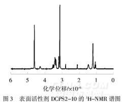 從圖3可以看出,3.14×10-6處為季銨鹽甲基上氫(a)的信號,3.43×10-6處出現羥基上氫(d)的信號,4.29×10-6處為與羥基相連碳原子上氫(c)的信號,1.21×10-6處出現分子中長碳鏈亞甲基上氫(h)的信號,1.48×10-6處出現醚鍵隔一位的亞甲基上氫(g)的信號,在(3.18~3.37)×10-6集中出現了醚鍵兩邊和與氮原子相連的亞甲基上氫原子(b、e、f)的信號.