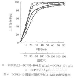 當染色溫度低于100℃時,加入表面活性劑,上染百分率降低;100℃時,隨著時間的延長,表面活性劑對上染百分率沒有影響.而隨著DCPS2-10用量的增加,各對應染色時間的上染百分率明顯下降.圖4中,當溫度升到90℃時,加入DCPS2-10 0.25 g/L,陽離子紅X-GRL的上染百分率為添加DCPS2-10 2 g/L的2倍.保溫一段時間后,最終的上染量基本相同.在圖5中,當染色溫度升高時,上染百分率也逐漸增加.保溫一段時間后,最終上染百分率達到平衡.