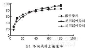 通過試驗發現,勻染劑的加入可明顯改善勻染性及蓋染能力,圖中顯示酸性染料用勻染劑后和活性染料相比,上染速率都有所降低,但最終的上染速率還是活性優于酸性染料。說明勻染劑適合活性染料,且能代替酸性染料染色。