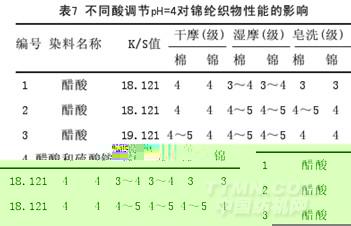 用醋酸調節pH值或用醋酸調節pH(其它的工藝條件同上面的工藝)時對織物染色K/S值結果如表7。