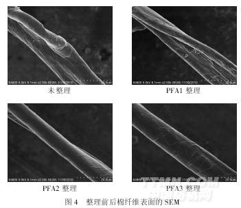 由圖4可知,未整理的棉纖維表面比較粗糙,有明顯的褶皺.整理后的棉纖維表面變得比較光滑,褶皺弱化甚至完全消失,這是整理后含氟共聚物在棉纖維表面形成一層均勻的薄膜,使棉纖維特有的天然表面形貌被覆蓋的緣故.