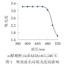 由圖1可知,隨著吸收波長的增大,試樣的吸光度最初不隨波長而改變,超過460nm,吸光度隨波長增加而緩慢減小,當波長增至約470nm時發生轉折,然后吸光度隨著波長的增大迅速減小.因此,可選用460nm作為測定波長。