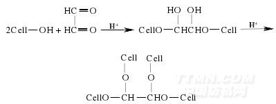 乙二醛是一種簡便易得的非甲醛類整理劑,在硫酸鋁催化作用下,用乙二醛溶液經浸軋→烘干→焙烘工藝處理棉織物或真絲織物,可使織物獲得防皺防縮效果.乙二醛分子中2 個醛基先與棉纖維分子的羥基反應生成半縮醛,再進一步反應生成縮醛,最終結果通過亞甲基醚鍵將纖維分子連接在一起,反應式如下[29]: