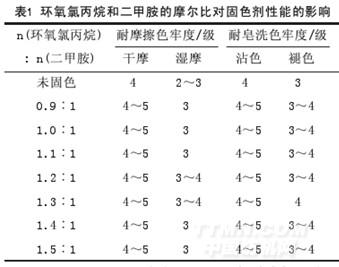 固定二甲胺和二乙烯三胺的摩爾比為1:0.1,改變環氧氯丙烷與二甲胺的摩爾比,合成不同的固色劑,考察兩者的摩爾比對織物固色效果的影響,結果如表1所示。