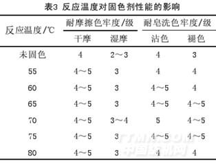 在20~25℃的條件下。當二乙烯三胺滴完后升溫至一定的溫度反應5h。研究反應溫度對固色劑性能的影響,其結果如表3所示。