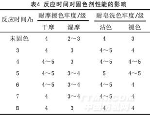在20~25℃的條件下。當二乙烯三胺滴完后升溫至70℃左右,通過改變反應時間來研究其對固色劑性能的影響,其結果如表4所示。