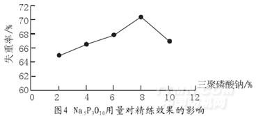 由圖4可得出結論,當Na5P3O10的用量為8%(omf)時,失重率最大為70.20%,可以獲得最佳的處理效果。