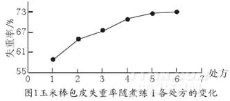 由圖1結合表4實驗結果可知,隨著氫氧化鈉等在各處方的改變,玉米棒包皮的失重率也隨著增加,在處方1和3之間,失重率增幅較大;在處方3和5之間,失重率增幅較小;在處方5和6之間,失重率幾乎沒有發生變化。為了使纖維的損傷較小和降低處理成本,綜合選擇處方2為煮練Ⅰ的工藝處方。