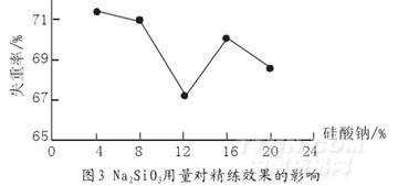 由圖3可得出結論,當Na2SiO3的用量為4%(omf)時,失重率最大為71.41%??梢垣@得最佳的處理效果。