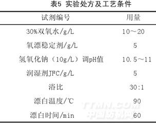 對(duì)提取的玉米棒包皮纖維進(jìn)行氧漂,漂白實(shí)驗(yàn)處方及工藝條件見表5。