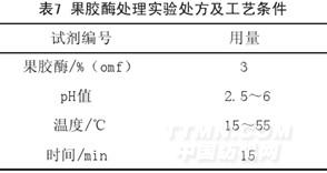 除氧酶處理后的玉米棒包皮纖維,經果膠酶處理實驗處方及工藝條件見表7。