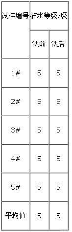 在日常檢測中,對織物的拒水級別測試,一般用淋水性能測試方法。按照GB/T4745—1997《紡織織物表面抗濕性測定沾水壓試驗》中要求的取樣、操作程序、評定進行,織物的經向與水流方向平行,分別測試洗前、洗后試樣的拒水級別,結果見表2。