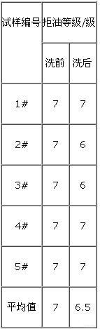 拒油等級測試采用GB/T19977—2005《紡織品 拒油性 抗碳氫化合物試驗》標準中方法。首先是用最低編號的實驗液體,以0.05 mL液體小心滴于織物上,如果在30 s內無滲透和潤濕現象發生,則緊接著用較高編號的實驗液體滴于織物上。實驗連續進行,直至實驗液體在30 s內潤濕液滴下方和周圍的織物為止。織物的拒油等級以30 s內不能潤濕織物的最高編號的實驗液體表示。