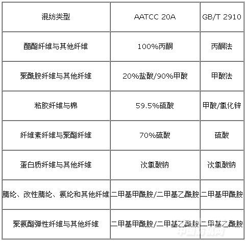 在進行相同的纖維含量分析過程中,AATCC與我國標準在溶解過程中試劑的選擇有異同(見表 2)。