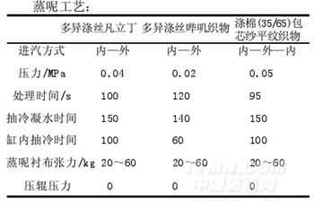 毛織物在經(jīng)過一定張力、高溫熱定形處理后,內(nèi)部會殘留內(nèi)應力,如果將此織物制成服裝,容易引起變形,從而影響織物的一些特性。因此在整理的最后階段必須經(jīng)過蒸呢處理,通過蒸呢,在濕熱和松弛條件下,纖維、紗線及織物的殘余內(nèi)應力得以消除,這樣的織物不但平整挺括而且還可以改善織物的彈性、極光等[1-3]。以前,蒸呢主要應用于純毛織物或毛滌混紡織物等,對于其它纖維的蒸呢研究較少,本文就是根據(jù)羊毛、化學纖維等在濕熱條件下經(jīng)過適當處理,可獲得增進定形效果的原理,對多異滌絲嗶嘰織物、多異滌絲凡立丁和滌棉包芯紗平紋織物在不同的工藝下用罐蒸機進行蒸呢處理,研究罐蒸對上述織物的影響。