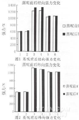 按照上述蒸呢工藝條件對(duì)織物進(jìn)行蒸呢處理,蒸呢前后織物的經(jīng)、緯向強(qiáng)力變化如下圖: