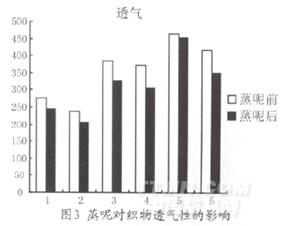 按照上述蒸呢工藝條件對(duì)織物進(jìn)行蒸呢處理,蒸呢前后織物的透氣性能變化如下圖3: