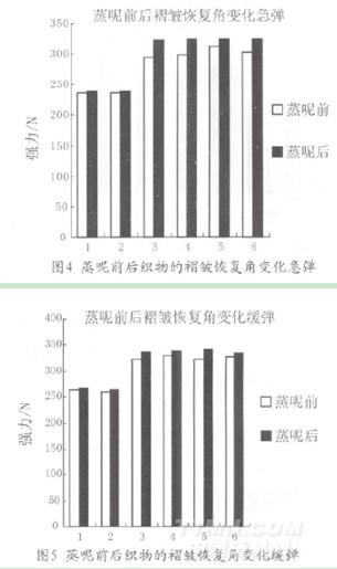 按照上述蒸呢工藝條件對(duì)織物進(jìn)行蒸呢處理,蒸呢前后織物的褶皺恢復(fù)性能變化如下圖: