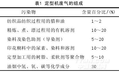 定型機在生產(chǎn)過程中產(chǎn)生大量廢氣,每臺定型機每小時大約產(chǎn)生8000 m3的廢氣,排放出來的煙氣溫度達到90~160℃左右,紡織品中附著的油質(zhì)、蠟質(zhì)及柔軟劑、樹脂等在高溫條件下變?yōu)闅鈶B(tài),含有粒狀污染物(包括氣溶膠、油霧)、有機物蒸汽,所含油滴粒徑大多小于1微米。當外界氣壓較低時,這些帶刺激性的氣味及滾滾白煙,會對環(huán)境的污染比較嚴重,給周圍的人民群眾身體健康帶來不良的影響。