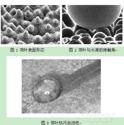 防污自潔膜材就是膜材表面沾上灰塵或其它污物后可以被雨水沖刷或風力帶走而無需洗滌,這種自清潔的功能是德國Barthlott 教授及其同事通過觀察荷葉表面的微觀結構而得出的,他們認為這種自潔性能是由荷葉粗糙表面上微米結構的乳突以及納米結構的蠟晶的存在共同引起的,并將此現象命名為荷葉效應(Lotus-Effect)[1],如圖1~3所示。隨著人們環保意識的增強,對于這種具有自清潔功能的膜材的研究將會備受關注。