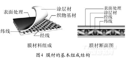 建筑膜材一般采用紡織品為基材,施以防水涂層劑并對涂層表面進行功能化處理而制成[3-5]。其結構組合為:織物基材層、高分子功能涂層和表層,如圖4所示。