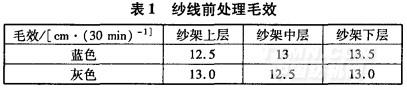 由表1可知,苧棉紗線前處理半成品的毛效為l0一15cm/30min,而同紗支純棉紗線前處理半成品的毛效也在l0~15cm/30rain范圍內,符合染色要求。
