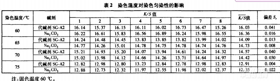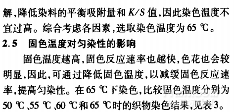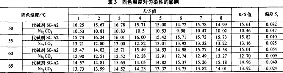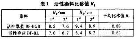 從表1可知,兩只染料的比移值甩都小于0.9,表明染料直接性小【2】。這兩只染料的分子結(jié)構(gòu)均較大.吸附與擴(kuò)散速率較慢,移染性差,染色平衡時(shí)間相對(duì)較長(zhǎng),容易染花。活性翠藍(lán)一般為酞菁染料,其母體分子較大,所以溶解度較低口J。由于鹽析效應(yīng),活性翠藍(lán)溶解性會(huì)進(jìn)一步降低,造成染料凝聚,形成表面染色,對(duì)勻染不利。因此,要解決T/R針織布翠藍(lán)色花,要從提高染料的反應(yīng)性、擴(kuò)散性,以及降低固色速率和減少固色色花等方面著手。