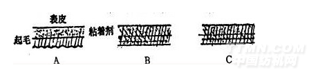 層壓工序是合成革生產(chǎn)中的關(guān)鍵部份,掌握好層壓條件,對(duì)產(chǎn)品的質(zhì)量風(fēng)格具有極大的影響,而不適當(dāng)?shù)膶訅簵l件,造成產(chǎn)品剝離強(qiáng)度的下降、或轉(zhuǎn)移后花紋的不清晰,以及表面起縐現(xiàn)象……等等。以起毛布的層壓為例,當(dāng)粘合劑浸漬起毛部的2/3情況下[圖4(C)]合成革表面平正狀態(tài)好,見圖4所示;