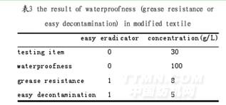 評(píng)定防水用AATCC-22樣卡,等級(jí)為0、50、70、80、90、100,其中0最差,100最好;評(píng)定防油用AATCC-118樣卡,等級(jí)為1、2、3、4、5、6、7、8,其中1最差,8最好;評(píng)定易去污用AATCC-130樣卡,等級(jí)為1、2、3、4、5,其中1最差,5最好。由表3可知,織物在用易去污劑表面改性前,極易沾污;織物在用易去污劑表面改性后,易去污性能很好。功能基團(tuán)交換樹(shù)脂由全氟烷基丙烯酸乙酯、丙烯酸十八烷基酯、甲基丙烯酸羥乙酯共聚,與架橋劑封端異氰酸酯交聯(lián)在織物上成膜。織物處在空氣中,親水基團(tuán)回縮在膜的內(nèi)部,有利于全氟烷基定位在織物的表面,架橋劑封端異氰酸酯交聯(lián)使膜的強(qiáng)度增大,使全氟烷基遇水滴不回縮,排列非常整齊指向空中而表面張力低,織物的防污效果好。當(dāng)織物浸入水中,在高表面能環(huán)境的誘導(dǎo)作用下,親水基團(tuán)交換到膜的表面,全氟烷基回縮到膜的內(nèi)部,同時(shí),從全氟烷基碳間隙沾到織物上的污垢被親水基反轉(zhuǎn)時(shí)帶到表面。由于親水基定位在織物的表面,因此織物表面與水的界面張力極低,織物表面的污垢很容易脫落于水中[9],織物的易去污性能好。織物在空氣中晾干后,親水基團(tuán)回縮到膜的內(nèi)部,全氟烷基交換到膜的表面,織物又具有防污作用。最好晾干后的織物熨燙一下,否則織物的防污效果要差一些。這可能是織物內(nèi)部含有水分,全氟烷基排列有些混亂,當(dāng)織物內(nèi)部水分蒸發(fā)掉后,全氟烷基排列非常整齊。