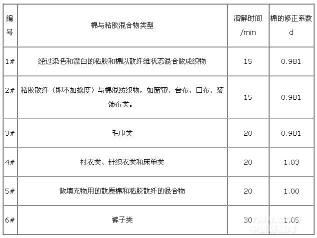 實(shí)踐表明,根據(jù)國標(biāo)GB/T2910.6—2009《粘膠纖維、某些銅氨纖維、莫代爾纖維或萊賽爾纖維與棉的混紡產(chǎn)品定量化學(xué)分析方法》中規(guī)定的甲酸/氯化鋅方法,無法準(zhǔn)確地檢測(cè)所有棉與纖維素纖維混合物的含量,因?yàn)榧姿?氯化鋅對(duì)棉的影響是根據(jù)棉纖維的狀態(tài)不同而變化的,它對(duì)不同狀態(tài)棉的修正系數(shù)不相同。另外,不同狀態(tài)的纖維素纖維(以粘膠、萊賽爾莫代爾為例)在甲酸/氯化鋅溶液中的溶解性能也不同, 所需要的溶解時(shí)間也不同。本文通過試驗(yàn)和經(jīng)驗(yàn)對(duì)粘膠與棉混合物的定量分析進(jìn)行了研究,總結(jié)出如下試驗(yàn)方法以及各試驗(yàn)方法中棉纖維的修正系數(shù)d的值。