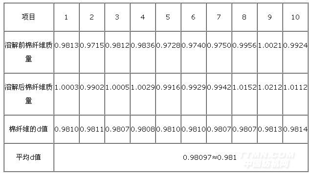 將同形態的棉纖維分別稱取10份,每份約1克,放入已預熱好的100 mL甲酸/氯化鋅溶液中,同時帶入類似形態的粘膠一小縷,記錄溶解時間(即帶入的粘膠徹底溶解后)。將剩余物洗凈、烘干、稱重,按照公式 計算d值。其中,m0—預處理前棉纖維干重,g;m1—溶解后的棉纖維干重,g。