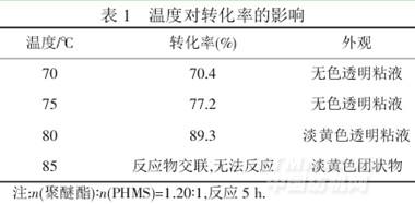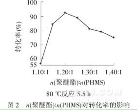 由圖2 可知,隨著n(聚醚酯)∶n(PHMS)的增加,轉(zhuǎn)化率先增加后減小,n(聚醚酯)∶n(PHMS)=1.20∶1 時(shí),轉(zhuǎn)化率最大,可達(dá)92.4%,原因是>1.20∶1 后,聚醚酯之間發(fā)生了副反應(yīng).因此,選擇n(聚醚酯)∶n(PHMS)=1.20∶1.