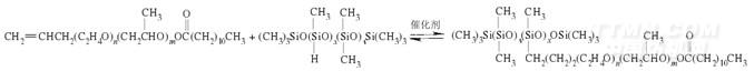 在配有攪拌器、球形冷凝管、氮?dú)鈱?dǎo)氣管的干燥三口燒瓶中加入自制低含氫硅油、聚醚酯、溶劑甲苯和0.002%(對(duì)反應(yīng)物質(zhì)量)氯鉑酸(催化劑).通入氮?dú)?攪拌,升溫至合適溫度,反應(yīng)一定時(shí)間,得無(wú)色透明粘性液體.55 ℃下進(jìn)行減壓蒸餾,蒸出溶劑甲苯.反應(yīng)式如下: