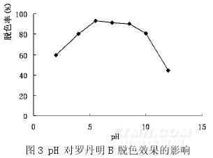 pH 值影響著反應(yīng)體系中自由基的生成和脫色效率。因?yàn)椋瑢?duì)于過硫酸根,在不同的pH 值條件下,生成的自由基不同,其氧化能力也不同;一般酸性條件下,過硫酸根反應(yīng)產(chǎn)生更多的硫酸根自由基;在堿性條件下,硫酸根自由基則更易于向羥基自由基轉(zhuǎn)化,從而產(chǎn)生了更多的羥基自由基。試驗(yàn)中,先將溶液調(diào)節(jié)成不同的pH 值后,加入過硫酸鉀和Fe(Ⅱ)以觀察不同的初始pH 值對(duì)羅丹明B 脫色效果的影響。在初始[羅丹明B]=50mg/L,[K2S2O8]=3mmol/L,[FeSO4]=1mmol/L 的條件下,改變初始pH 值后加入氧化劑,反應(yīng)時(shí)間為2h,羅丹明B 脫色效果如圖3 所示。從圖中可以看出,羅丹明B 的分解脫色速率受pH 的變化的影響,pH 值較低和較高都不利于羅丹明B 的脫色效果,而在反應(yīng)體系為中性左右脫色效果較好,尤以微偏酸(pH=5 左右)條件下最好,羅丹明B 脫色率達(dá)到90%以上。