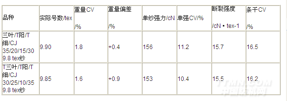 該系列紗線產品質量除纖維含量未檢測外,其余技術指標均達到GB/T 398—1993《棉本色紗線》國家標準一等品以上要求。