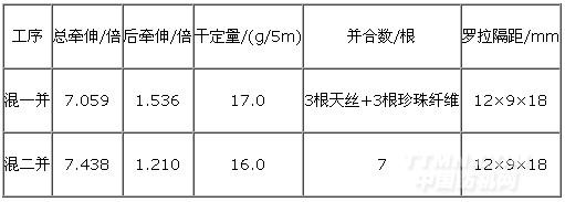 并條工序采用“重加壓、大隔距,合理設置的牽伸倍數的工藝原則”。由于天絲纖維與珍珠纖維要按一定比例在并條工序進行混合,所以要保證混合均勻,適當降低車速,減少棉結增加機率,同時又要兼顧該品種賽絡紡制的工藝要求,合理設計定量。并條工序主要工藝參數見表1。