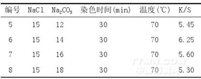 通過上述實驗不難得出竹纖維染色時碳酸鈉的最佳濃度為14g/L,在此值之下,染液的堿性較強,利于纖維素的離子化,纖維素負離子的濃度增強,纖維的膨脹增大,因此鍵合反應速率提高,固色率一般也將提高。但當碳酸鈉的濃度高于此值時,染液的pH值增高,染液中[OH-]比纖維中[Cell-O-]增加更快,[Cell-O-]/[OH-]的值減小,水解反應的比例將增加,因此在活性染料固色時碳酸鈉的濃度過高是不利的。