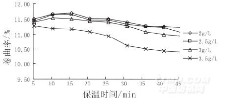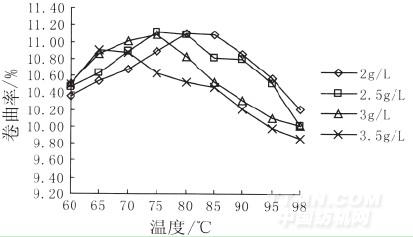 從曲線圖可知,在相同堿濃度下,溫度75℃之前,隨著溫度的升高,卷曲率有明顯提高,但當(dāng)溫度高于75℃以后,卷曲率開始快速減小。
