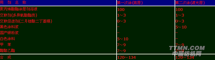 ⑵ 工藝流程和條件:半制品→預(yù)處理→底涂→烘干→第二次涂遮光層→烘干→第三次涂表層→烘干 工藝條件:預(yù)處理,預(yù)防水(處方同前),烘干或平軋光。 涂層: 底涂:用浮刀法銳角刮刀。 第二次遮光層:用浮刀法圓形刮刀,必要時可重復(fù)一次。 第三次表層:用浮刀法銳角刮刀。 烘干:90~100℃。