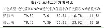從表3-7可看出,聯(lián)合改性的工藝中織物擴(kuò)散面積、透氣率、保溫率有所提高,透氣量減小這是因?yàn)橛鹈鞍字鷦┤狈Ψ磻?yīng)性基團(tuán),與滌綸織物結(jié)合不牢固,除了有必要的高反應(yīng)性交聯(lián)劑外,還需要選擇合適的改性工藝方法及條件,浸漬改性后的織物再進(jìn)行高溫焙烘,使纖維分子鏈運(yùn)動(dòng)加劇,纖維分子中內(nèi)應(yīng)力降低,結(jié)晶度和晶區(qū)有所增大,非晶區(qū)趨向集中,將羽毛蛋白助劑,交聯(lián)劑與纖維結(jié)合的更加緊密,更加牢固,纖維表面親水性基團(tuán)增多,復(fù)配羽毛蛋白處理到織物上,在織物表面形成一層不完整的親水性膜,導(dǎo)致透氣量有少量降低,滌綸織物舒適性能有所提高。所以選擇浸漬與浸軋聯(lián)合的改性方法處理滌綸織物。